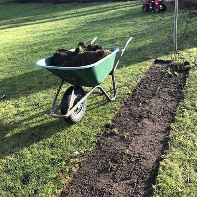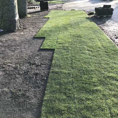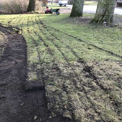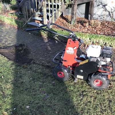 Zu sehen ist hier die Mietmaschine, der Sodenschneider. Schnell und einfach lässt sich eine alte Rasenfläche abtragen, die Fläche neu planieren und mit Rollrasen neu auslegen.